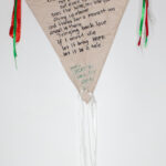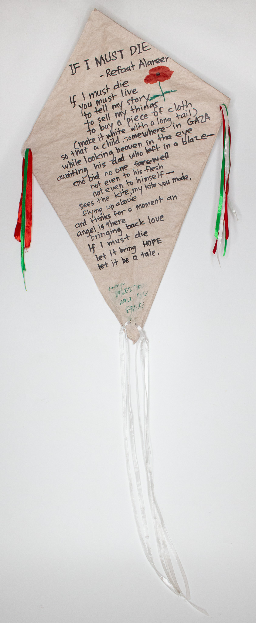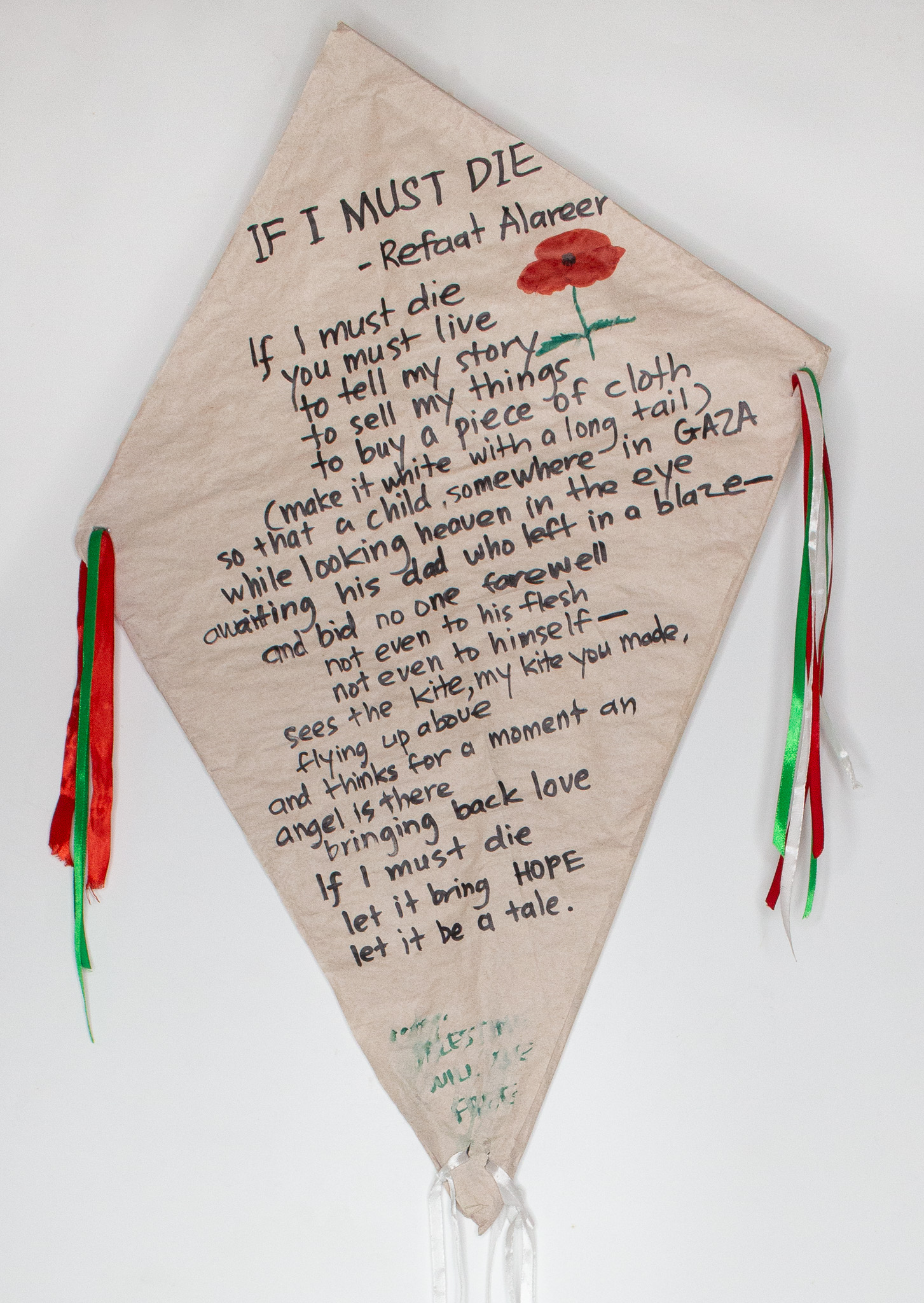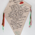A poem by a Palestinian writer, Refaat Alareer, is written on a kite, echoing with his words: “…sees the kite, my kite you made, flying up above and thinks for a moment an angel is there bringing back love…” This poem is a symbol of Palestinian resilience after Alareer was killed in an Israeli airstrike in Gaza in December 2023. The green, red and white ribbon straps on the side and bottom of the kite symbolise the colours of the Palestinian flag. A poppy flower is drawn beside the poem. The poppy’s red petals represent the resistance and sacrifice of the Palestinian people and their bloodshed for their nation.
